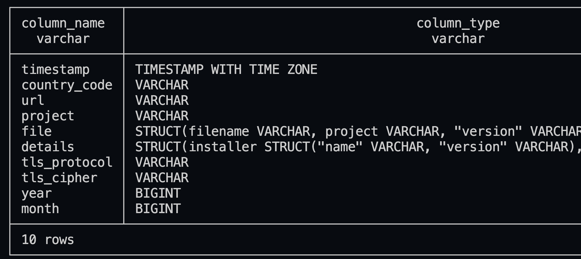 DESCRIBE TABLE 's3://us-prd-motherduck-open-datasets/pypi/sample_tutorial/pypi_file_downloads/*/*/*.parquet';