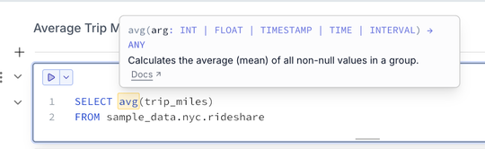 Inline Docs help users understand DuckDB and MotherDuck SQL functions without leaving the query editor. Hover over any SQL function name in the editor to see details including the function description, parameter types, and return types. Clicking the "Docs" link in the tooltip opens the function's reference documentation.