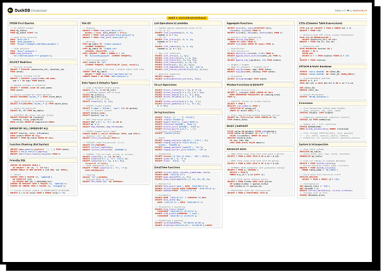 A two-page reference for developers who already know SQL and want to move fast with DuckDB. Covers the full DuckDB surface in a scannable, copy-paste-ready format. Built for humans and LLMs alike.