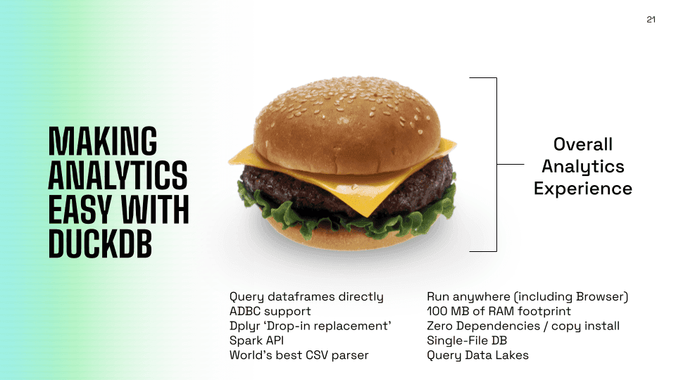 He used a burger metaphor. Database companies tend to focus on the patty—the query engine, the storage format, the core performance. Everything else—how you get data in, how you integrate with tools, the overall user experience—gets treated as somebody else's problem.