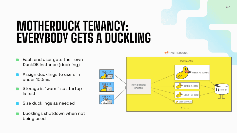 In MotherDuck, everybody gets a duckling—our term for individual DuckDB instances. We can spin up a new duckling in under 100 milliseconds, faster than human reaction time. Each user is isolated. They can scale up independently, and they shut down immediately when not in use.