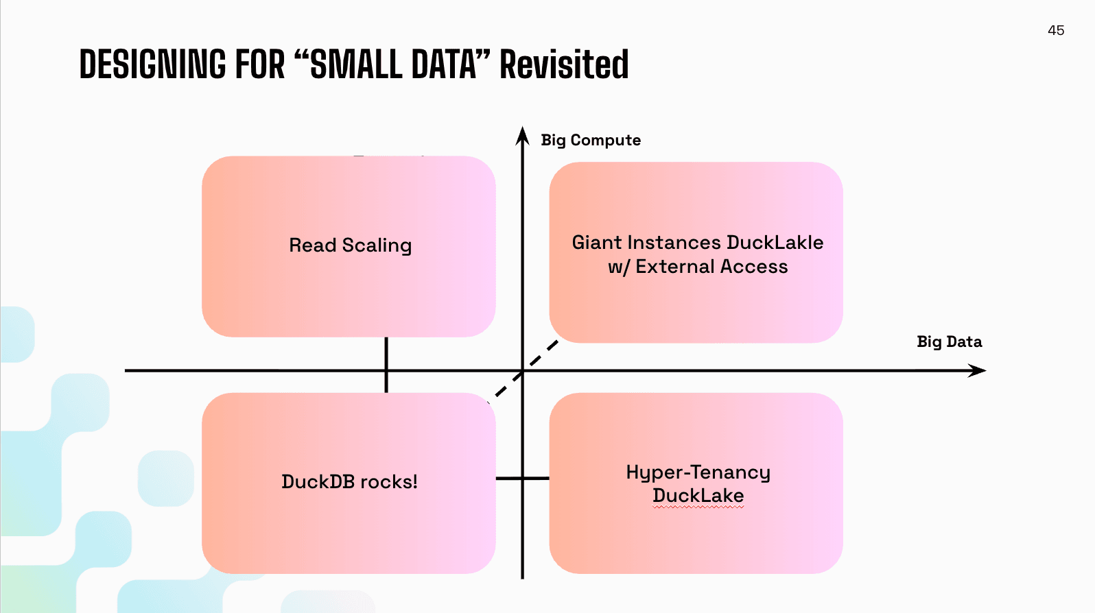 Jordan wrapped up by mapping our solutions back to the quadrant. Small data, small compute—DuckDB rocks here. Increase the data size—DuckLake and hypertendency have you covered. Increase the compute—read scaling handles it. And for the actual big data, big compute corner—giant instances and DuckLake's openness to external engines.